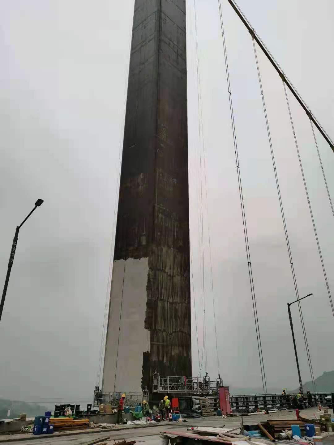長(zhǎng)壽經(jīng)開(kāi)區(qū)大橋主橋共設(shè)計(jì)南、北兩座門(mén)式框架結(jié)構(gòu)主塔。主塔由上、下塔柱,上、下橫梁,鞍室及弧形墻等組成。南主塔總高度140.0m,北主塔總高度146.5m。主塔上橫梁的高度為7m,寬度為5.931m,頂面標(biāo)高為+319.228m。上橫梁采用矩形空心箱型截面,單箱單室。主塔下橫梁的高度為8m,寬度為5.931m,頂面標(biāo)高為+228.120m。下橫梁采用矩形空心箱型截面,單箱單室。主塔內(nèi)部及下橫梁涂裝顏色為金黃色,主塔外部涂裝顏色為灰白色,引橋橋墩涂裝顏色為中灰色,引橋梁腹涂裝顏色為灰白色,錨碇外表面涂裝顏色為中灰。涂裝總面積近8萬(wàn)平方米。