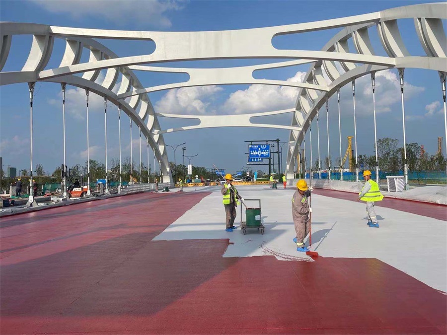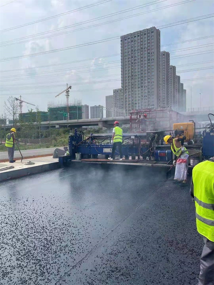 由我公司承擔(dān)施工的江蘇省鹽城市南海未來城鋼橋面鋪裝工程于2021年8月28日順利完工。該鋼橋面鋪裝項(xiàng)目分別由吉安路跨河橋、勝利路橋和康居路橋組成,鋼橋面鋪裝面積約為7960m2,橋面鋪裝結(jié)構(gòu)設(shè)計(jì)為:鋼橋面板噴砂除銹+甲基丙烯酸樹脂(MMA)防水體系+3.5cm聚合物改性瀝青澆注式混凝土GA-10+3.5cm高彈改性瀝青 SMA-10。