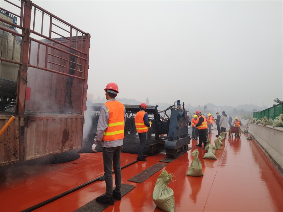 由我公司承擔(dān)施工的內(nèi)江繞城高速雙才互通鋼橋面鋪裝工程于2021年11月29日順利完工。雙才互通位于四川省內(nèi)江市,為內(nèi)江繞城高速與遂宜畢高速公路連接通道,跨線橋采用鋼箱梁橫跨遂宜畢高速公路,鋼橋面鋪裝結(jié)構(gòu)為:鋼橋面板噴砂除銹+甲基丙烯酸樹脂(MMA)防水體系+3.5cm聚合物改性瀝青澆注式混凝土GA-10+3.5cm高彈改性瀝青 SMA-10。