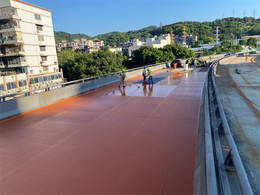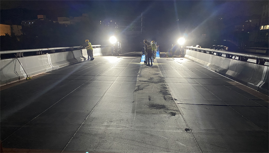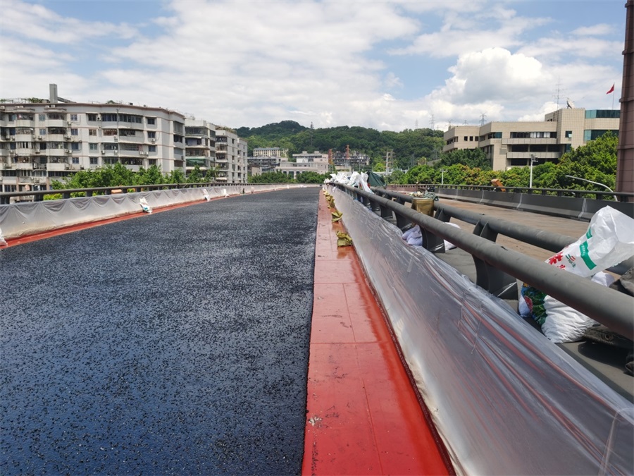 在進(jìn)行充分的施工準(zhǔn)備后,福州市工業(yè)路提升改造工程2標(biāo)鋼橋面鋪裝進(jìn)入正式施工階段,該標(biāo)段鋼橋面鋪裝面積約19000m2,目前已開始進(jìn)行鋼橋面噴砂防水作業(yè)。鋼橋面鋪裝結(jié)構(gòu)為:噴砂除銹+甲基丙烯酸樹脂防水層+4cm澆注式瀝青GA-10+4cm高彈改性瀝青SMA-10。