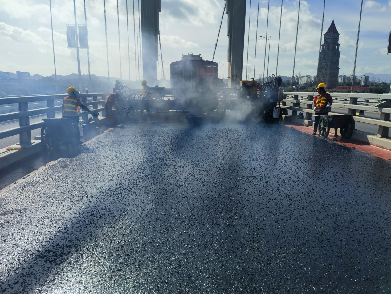 為順利完成鋼橋面鋪裝攤鋪施工任務(wù),項(xiàng)目部統(tǒng)籌規(guī)劃,多措并舉,不斷優(yōu)化現(xiàn)場(chǎng)人機(jī)料的資源配置,克服了天氣多雨、高溫、夜間施工等不利因素,按期保質(zhì)保量完成施工任務(wù),贏得了業(yè)主、總包單位和監(jiān)理單位的一致好評(píng),為公司進(jìn)一步開拓江西市場(chǎng)打下良好基礎(chǔ)。