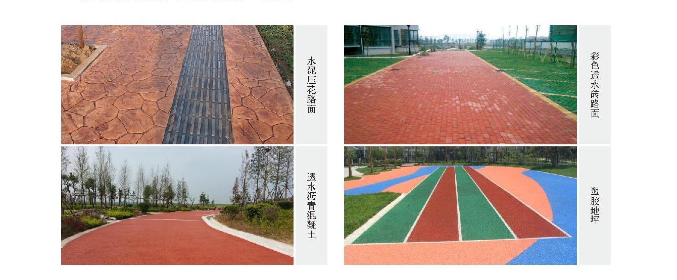 分類:水泥壓花路面、彩色透水磚路面、塑膠地坪。