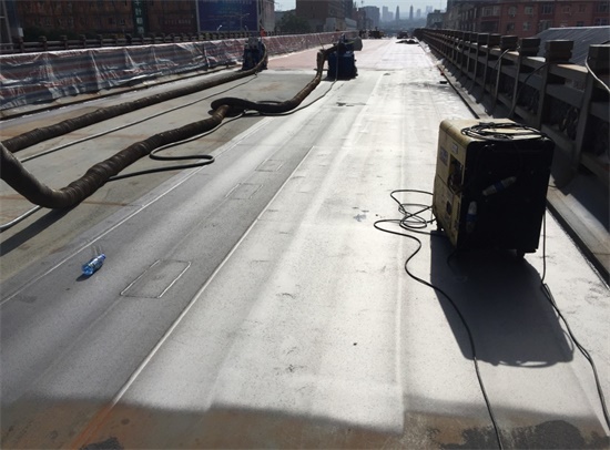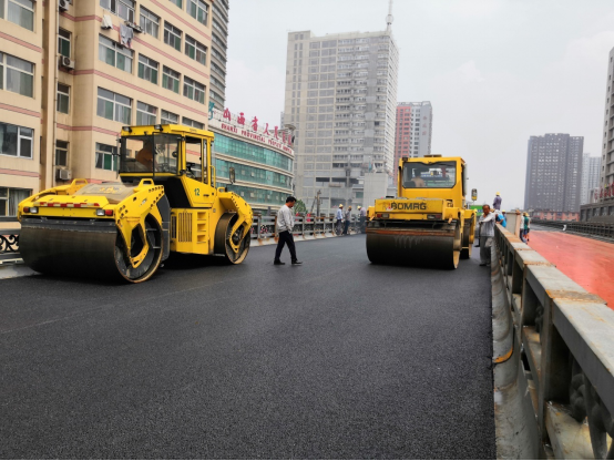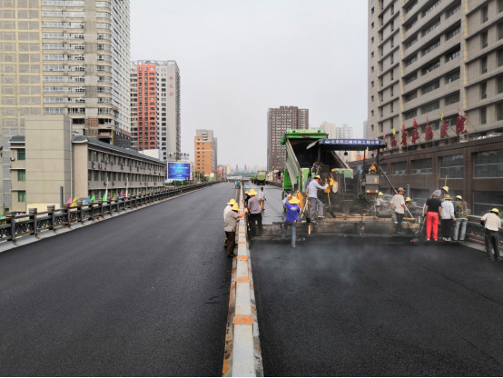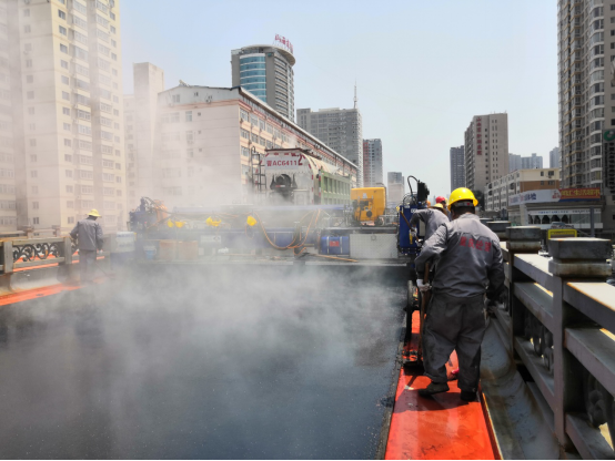 由我公司承建的山西省太原市雙塔寺街高架橋鋼橋面鋪裝工程于2019年6月30日順利完工。該項(xiàng)目其中鋼橋面鋪裝面積為13392m2,由多個(gè)鋼箱梁段組成,橋面鋪裝結(jié)構(gòu)設(shè)計(jì)為:鋼橋面板噴砂除銹+甲基丙烯酸樹(shù)脂(MMA)防水體系+3.5cm聚合物改性瀝青澆注式混凝土GA-10+3.5cm高彈改性瀝青 SMA-10。