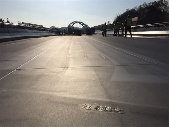 該項目地點位于貴陽市白云區(qū),為環(huán)城高速跨越觀云大道上垮橋,鋼箱梁橋面鋪裝方案為:鋼橋面板噴砂除銹+甲基丙烯酸樹脂(MMA)防水體系+3.5cm聚合物改性瀝青澆注式混凝土GA-10+3.8cm高彈改性瀝青 SMA-13。