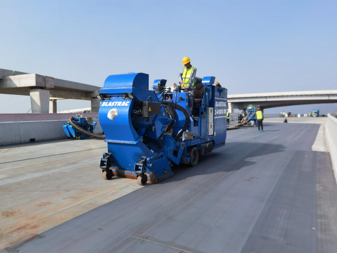 路澤太高架橋快速路工程是浙江省重點(diǎn)工程,連接臺(tái)州市椒江區(qū)和溫嶺市,它建成后將成為臺(tái)州地區(qū)的交通主動(dòng)脈,并極大的改善臺(tái)州市區(qū)及周邊地區(qū)的交通狀況。此次路澤太高架鋼橋面項(xiàng)目位于路澤太高架中段機(jī)場樞紐立交,鋼橋鋪裝總面積約13700平方米,鋪裝總厚度為82mm,具體鋪裝結(jié)構(gòu)組合為甲基丙烯酸樹脂防水體系(厚2mm)+澆注式瀝青混凝土GA-10(厚40mm)+高彈改性瀝青SMA-10(40mm)。值得一提的是本次鋪裝結(jié)構(gòu)中采用的澆注式瀝青混凝土GA-10在臺(tái)州地區(qū)尚屬首次應(yīng)用。